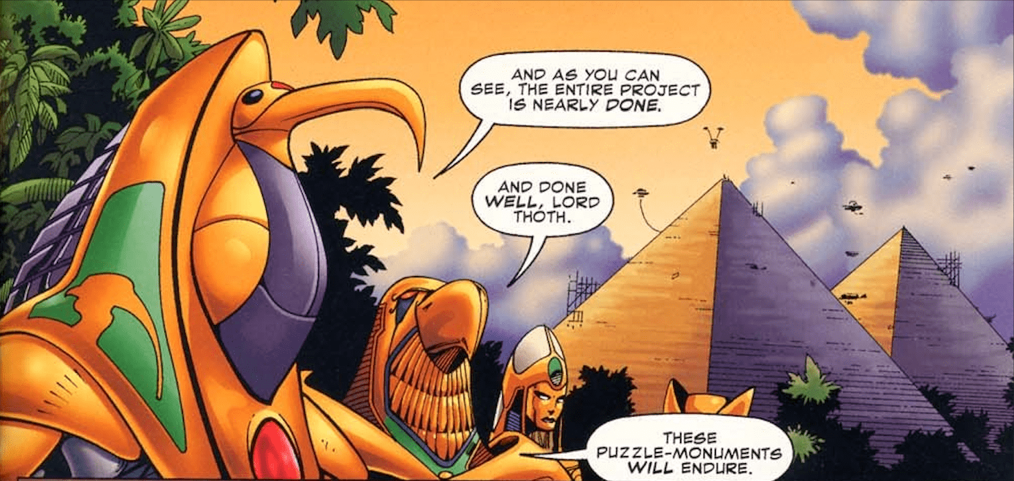 Published in June and July 1999, the two volumes of Batman: The Book of the Dead are a perfect illustration of the exploitation of the ancient astronaut theory in comic books. The story, which includes all the required clichés (extraterrestrials, pyramids, hidden knowledge, and so on), transports us 14,000 years ago on the eve of a cataclysm that is to eradicate most of planet Earth. Sensing the end of the world approaching, the extraterrestrials present on Earth, posing as Egyptian gods, decide to hide part of their advanced technological knowledge at the heart of the Giza pyramid complex before returning to their world. One of them, Seth, like in the Egyptian myth, rebels, kills, and dismembers his king, Osiris. Nekhrun, representing a bat god, faithful to his sovereign, tries to avenge him but is mortally wounded. He then locks himself in the great pyramid to forever guard the knowledge hidden by Osiris.